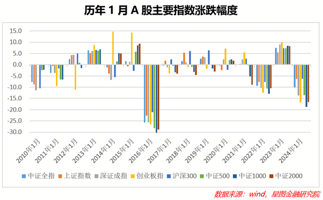 也就是说,去除2016年是因为制度带来的股灾外,2024年1月A股整体表现已经可以当选为历史表现最差。具体表现来看,中证2000代表的小盘股表现最差,1月-16.6%,创业板指-16.3%,中证1000指数-15.3%,深成指-12.1%,中证500指数-11.3%,中证全指-10.2%,沪深300指数和上证指数因为国家队资金的护盘,分别录得-5.4%、-4.9%的跌幅。