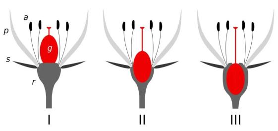 I:上位子房,II:半下位(中位)子房,III:下位子房。a:雄花器,g:雌花器,p:花瓣,s:萼片,r:花托 图源:维基百科当然你可能会问为什么红果参还有一个“肚脐”。和苹果石榴的“肚脐”不一样,这个小圈其实是红果参花冠残存的痕迹。