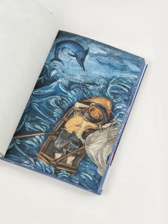 护封采用烫粉金和珠光白的工艺,“海上搏斗”彩色刷边,真实再现故事情节。