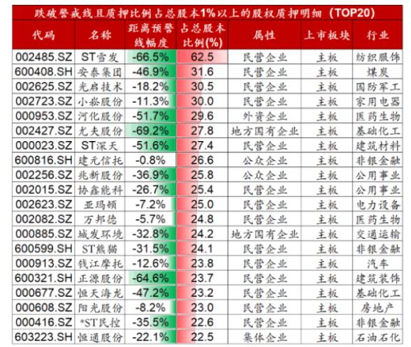 注:股权质押比例居前的个股(质押数据截至1月31日、涨跌幅计总市值数据截至2月1日)分行业来看,目前股权质押超三成的个股中,医药生物、基础化工、房地产数量较多,而计算机、家用电器、社会服务、石油石化股相对较少。若以企业性质角度统计,这些高质押股多为民营企业,其占比可达8成。此外,从质押警戒线层面看,据方正证券近日研报数据统计,目前跌破警戒线且质押占总股本1%以上的股权质押项目共1974个,其中,ST雪发、安泰集团、光启技术质押比例居前。