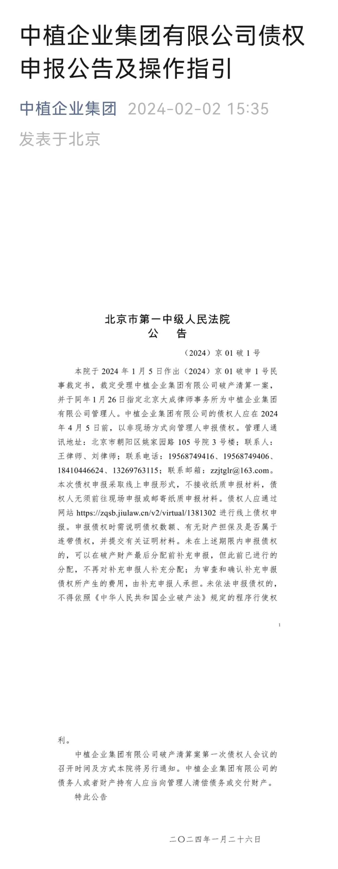 根据北京市第一中级人民法院(2024)京01破1号公告,该法院于2024年1月5日作出民事裁定书,裁定受理中植企业集团有限公司破产清算一案,并于同年1月26日指定北京大成律师事务所为中植企业集团有限公司管理人。