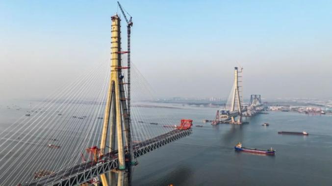 新春走基层·一线蹲点影像位于江苏的常泰长江大桥,是世界上在建的最大跨度公铁两用斜拉桥,集高速公路、城际铁路与普通公路“三位一体”。该桥连接常州与泰兴两市,是长江经济带综合立体交通走廊的“世纪工程”。