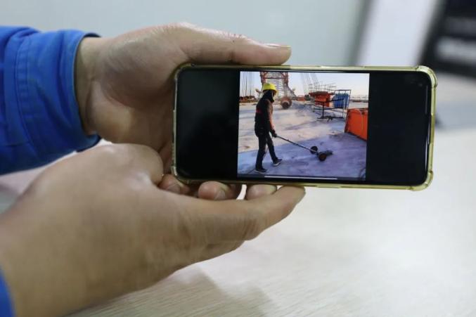 1月31日,全国五一劳动奖章获得者、A4标架子队队长蒋华在介绍他刚发明改造的清胶小工具。鲁宝军是要爬上主塔最高点的工人,作为电工的他需要在塔尖进行电路铺设、监控检修等工作,每上下一趟要一个小时左右。“虽然有防护,站在边缘有时还是有点手脚发软,这两天爬上去根本看不到地面。”鲁宝军说,在300多米的高空独自作业是对心理和生理的双重挑战。