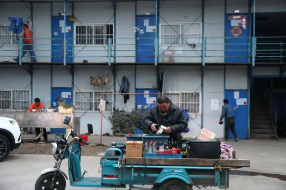 1月29日,附近的居民开着电动三轮来工人宿舍区卖东西。