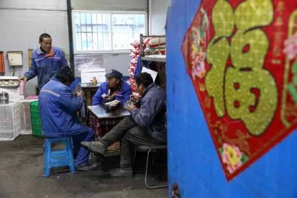 1月29日傍晚,工人宿舍区正在吃饭的工人。