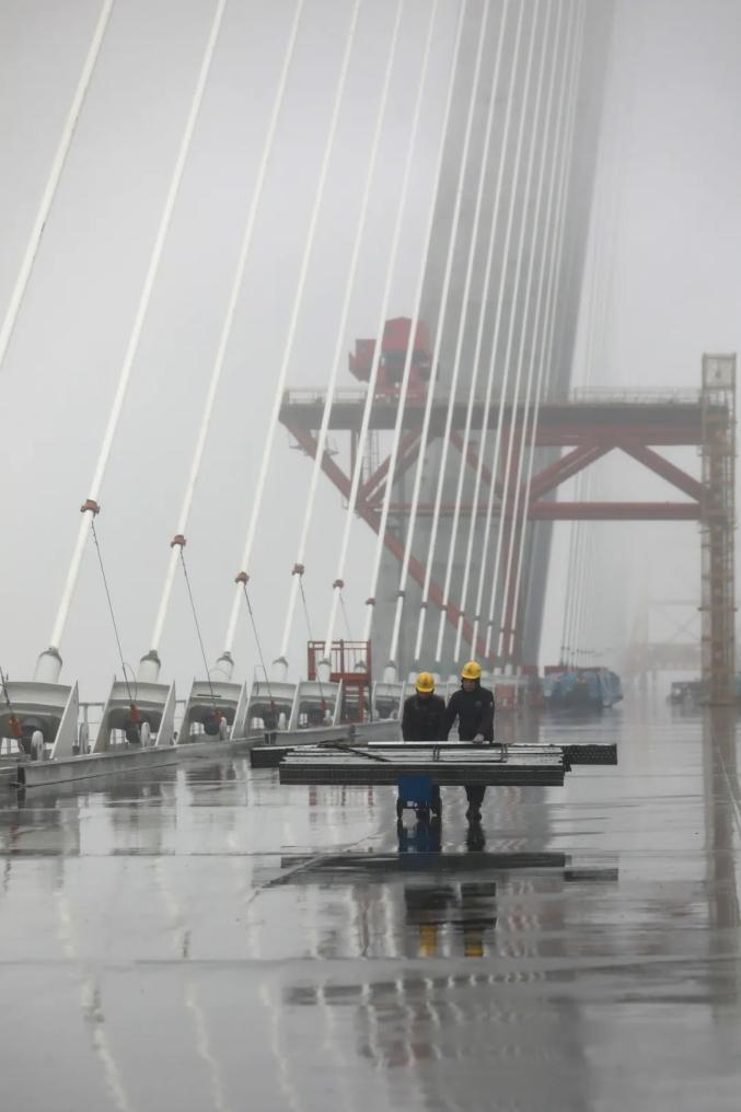 江面之上,连日的阴雨天气让人们的体感温度比地面还要低五六摄氏度。伴随着阴沉的天气,350米高的主塔有100多米掩盖在雾气里。寒风呼啸,工人只能裹着厚实的冬装在桥面上作业,行动也变得比往常迟缓。而过几天这里还将迎来新一轮降温天气。