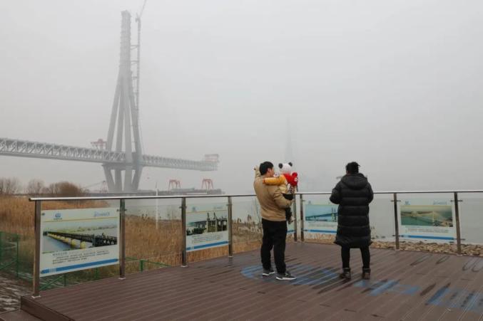 1月30日,常泰长江大桥观景平台上,专门前来观看建桥场面的一家人。