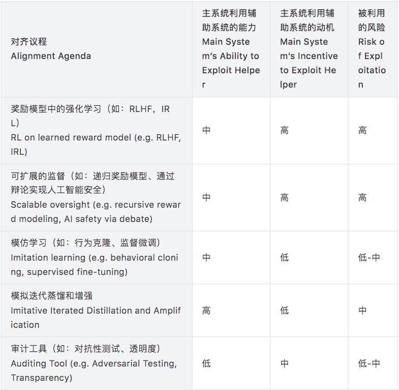 在表1中,我们提供了一个主观风险矩阵,表中展示了各种流行的对齐议程,并且评估了主要机器学习系统利用辅助系统的能力和动机的程度。我们发现许多对齐议程存在被利用的风险,所有议程至少存在一些风险。