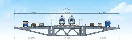 主桥采用四塔斜拉桥,公路与铁路平层布置,中间通行时速160公里双线城际铁路,两侧通行时速100公里双向6车道高速公路,是世界首座公铁平层合建多塔斜拉桥。主梁采用大挑臂式钢箱梁结构,桥面总宽度49.6米,两侧大挑臂长16米,其宽度为同类型桥世界之最。国内已建成的多塔斜拉桥仅有5座,可供借鉴的经验并不多,作为第一座公铁两用四塔斜拉桥,设计团队完成了从0到1的突破。