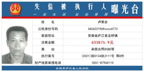 庐江法院公布失信被执行人名单