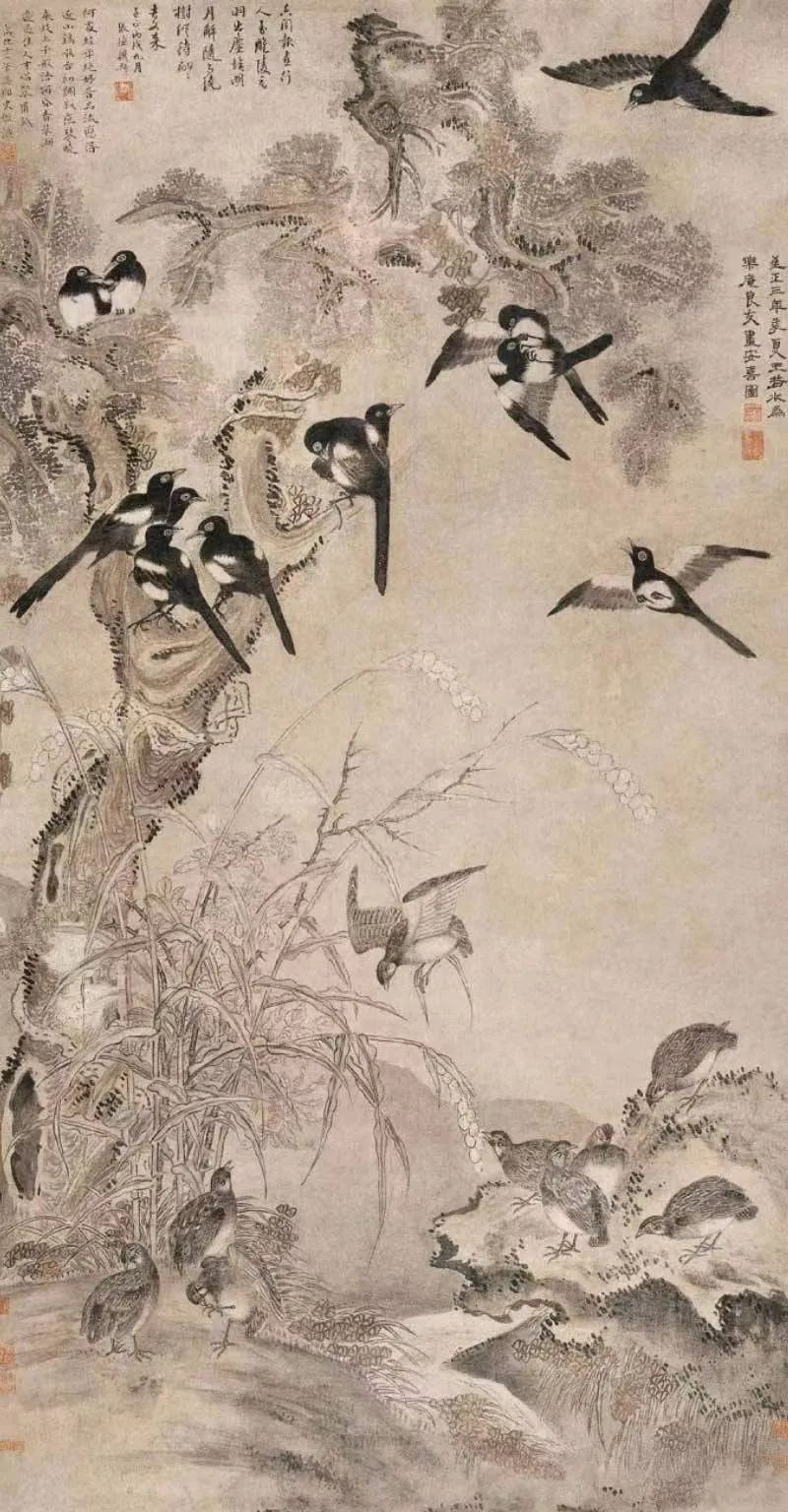 元代 王渊 《安喜图》鹌鹑、喜鹊,取音安喜,既报平安又报喜。九只鹌鹑,十二只喜鹊,九安十二喜。一年十二个月:月月皆喜庆,岁岁能久安。画幅画也如此用心良苦,古人真不容易,时时处处礼天敬地、讨吉利。