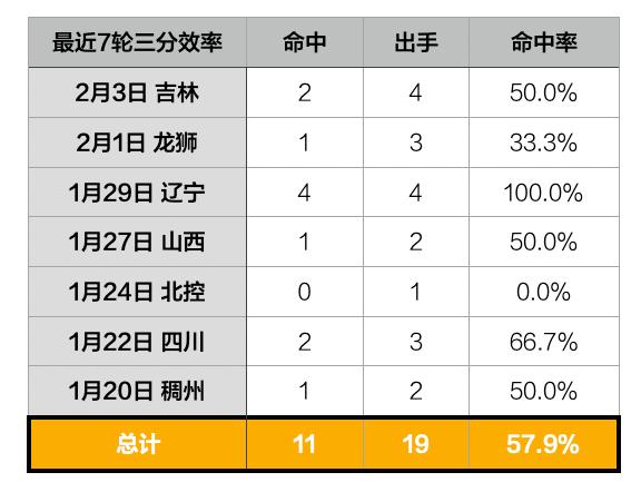 最近7轮比赛,李弘权总共19记三分出手,命中其中的11记,三分命中率高达57.8%。而这7轮比赛上海男篮也打出5胜2负的高光战绩,包括一段三连胜。