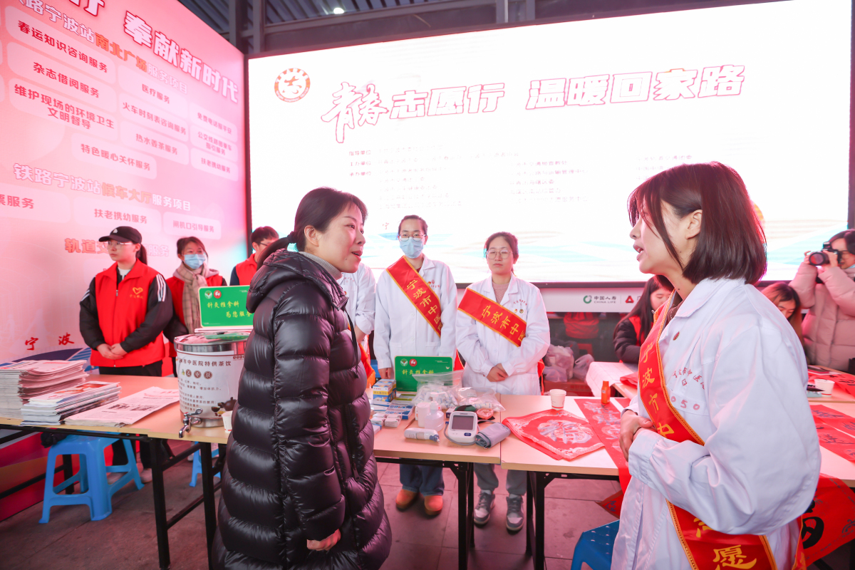 在春运志愿总站(南广场门口青年志愿服务站点),暖意融融,来自宁波市中医院的8名医务志愿者正在热情地忙碌着,为来来往往的旅客送上各类贴心的健康服务。