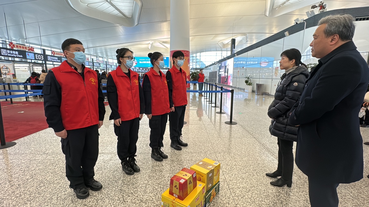 上午10点半许,慰问组又来到了宁波栎社国际机场T2出发平台,向机场春运志愿者们表达了慰问。