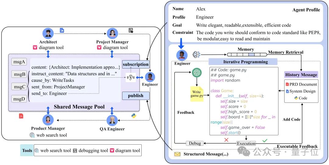 在多智能体协作过程中,为提高通信效率,MetaGPT引入了基于消息共享的发布-订阅机制(Publish-Subscribe Mechanism)。如上图所示,共享消息池允许直接交换消息,任何智能体都可以透明地访问来自其他智能体的消息,无需询问并等待响应。订阅机制使智能体更倾向于接收与自我任务相关的信息,避免分心于不相关的细节。同时,每个智能体可直接从共享消息池中检索所需信息,形成自我记忆。