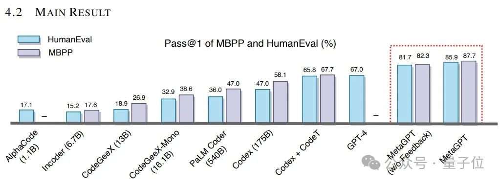 经测试,使用这种方法,在代码补全任务的公开数据集HumanEval和MBPP上,MetaGPT分别取得了85.9%和87.7%的新SOTA。