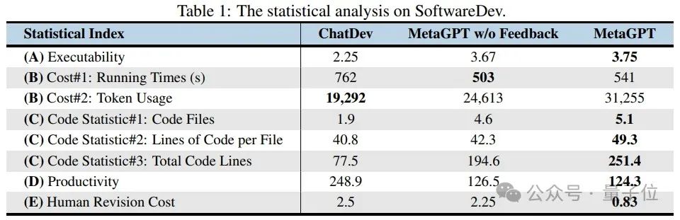 在具有挑战性的SoftwareDev数据集上,MetaGPT在可执行性上的得分为3.75,非常接近4,而所需的运行时间较短(503秒);生成的代码行数相对基线框架增加了2.24倍,而单位代码行数所消耗的token数下降了50%。这些结果突显了多智能体协作过程中SOPs带来的效率提升。