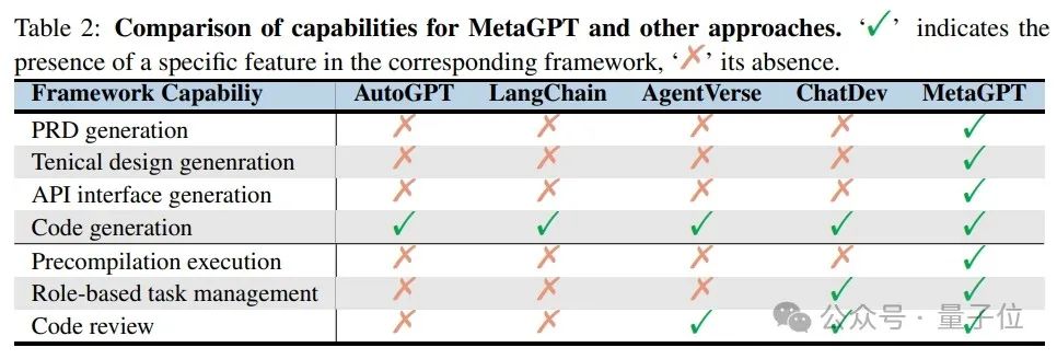 聚焦在软件开发领域,研究人员提供了不同智能体框架能力的定性对比。他们发现,MetaGPT不仅具备多种模态的文件生成能力,也是目前众多框架中唯一完整覆盖了真实世界中软件开发过程的开源框架。