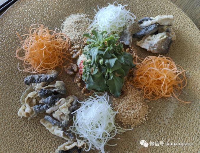 ▲三文鱼鱼生每年各讲究的餐厅还会调整鱼生的成分。比如2022年圣淘沙精品粤菜馆风水廷的捞鱼生,里面的青色用的不是常见绿色丝,而是冰菜。别致之处,也见各位大厨用心。