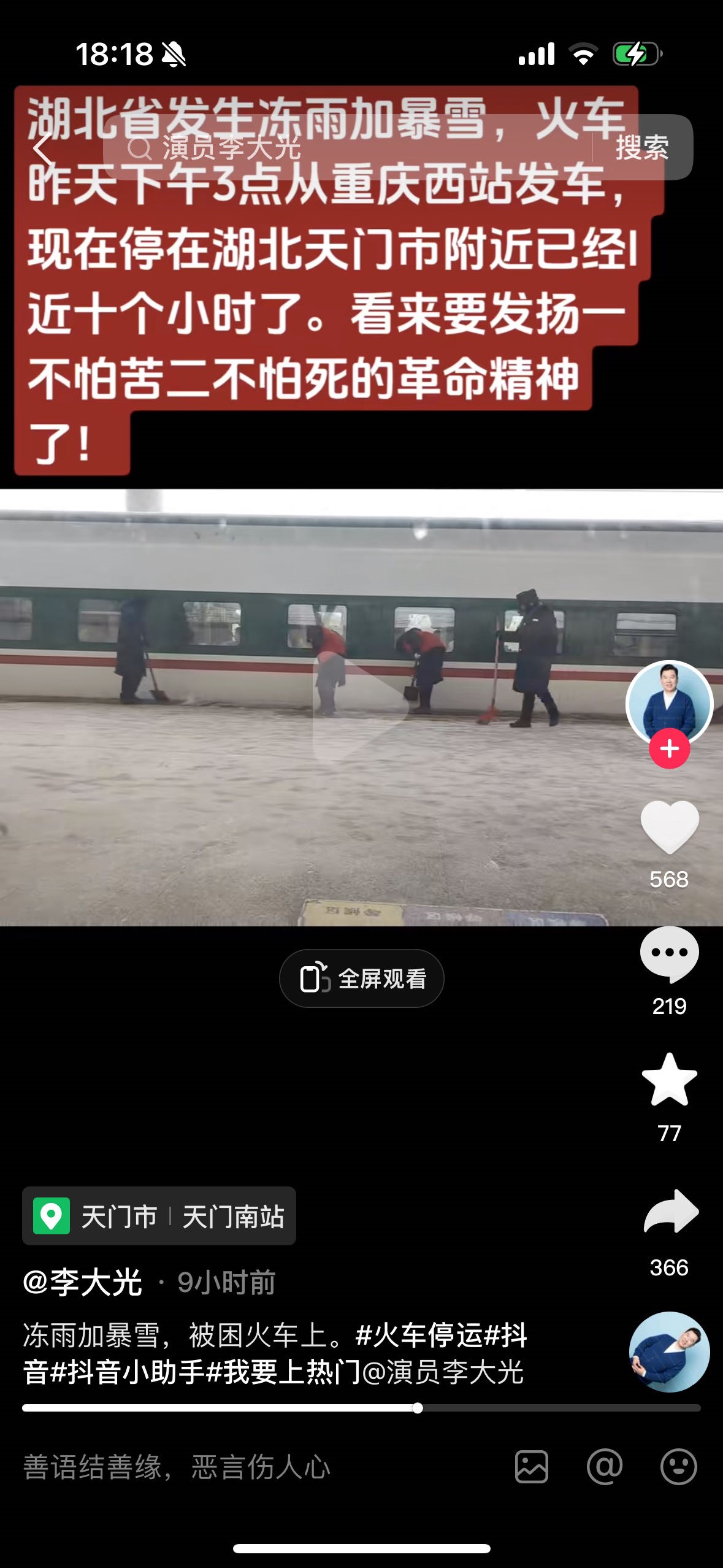 “湖北冻雨加暴雪,火车昨天(2月2日)下午3点从重庆西站发车,现在停在湖北天门市附近已经近十个小时了。”演员李大光2月3日在社交平台上发布视频称。