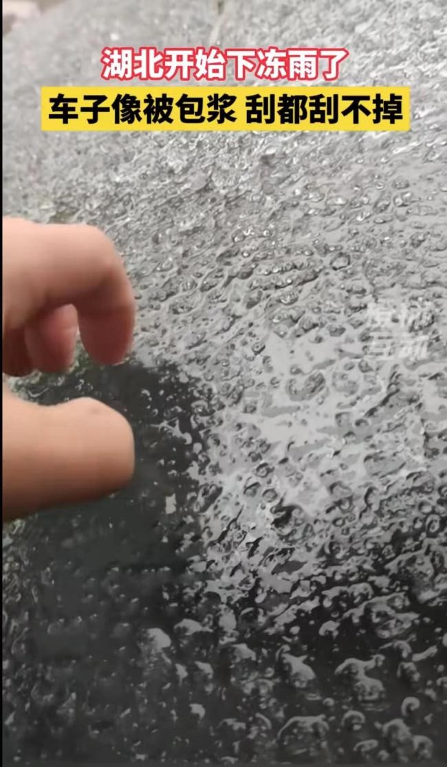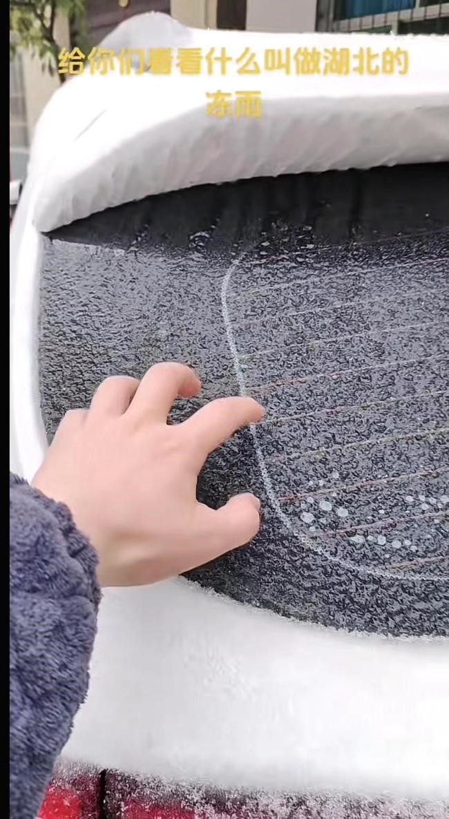 对于车主来说,车辆被冻雨覆盖是一种非常棘手的问题。冰层的存在导致车门无法打开、车窗无法关闭,甚至会影响到车辆的正常行驶。在社交平台上,有湖北天门的网友拍摄的视频画面显示,她用力尝试用手指去抠冰,但由于冻雨形成的冰坚硬而厚重,她无法移动冰层,车子像被“包浆”了一般。