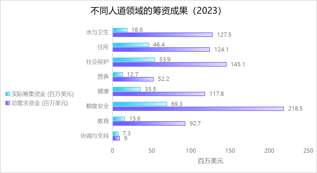 从领域划分,粮食安全是2023年缅甸人道援助响应计划中需求预算最高的领域,共需求资金2.18亿美元,不过实际筹集资金仅为6930万美元,不到需求的三分之一。社会保护、水与卫生、住所也是资金需求较大的领域,均超过1亿美元,而这些领域实际筹集资金远低于需求资金的一半,其中水与卫生领域实际筹集资金仅有需求资金的15%左右。