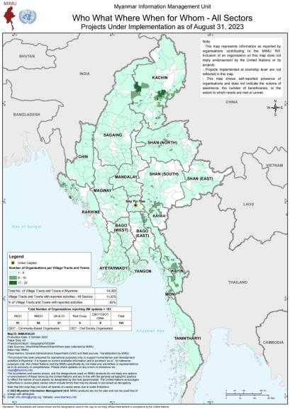 从2021年到2024年,许多组织的策略从应对短期危机的人道援助转向对更多中长期问题的结构化响应,旨在建立社会韧性和支持可持续发展。基于缅甸发展项目信息平台MIMU的数据,2023年多类主体在教育、卫生、基础设施、青年事务等各发展领域开展了工作。图4展示了包括政府间国际组织、国际非政府组织、本土机构在内的不同类型机构在缅甸开展的所有领域、教育领域、卫生领域的主要项目分布图,可以看出大量的发展工作依然深入少数民族地区和一线,且基本覆盖全国。