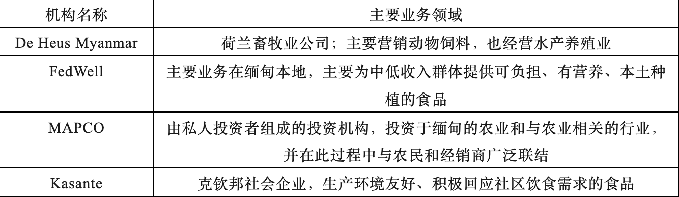 近期,在生计和粮食安全基金(LIFT Fund)的支持下,联合国粮农组织发起了SUN Business Network,主要致力于为缅甸中低收入家庭提供可负担且有营养的食品。SUN是一个会员网络,目前共有9家生态合作伙伴(多为国际组织和缅甸全国性组织)和44家会员机构(多为缅甸本土从事咖啡种植、水果生产等农业食品业的企业)。通过资源对接、能力建设、传播倡导等方面工作,SUN帮助缅甸消费者对接农业和食品领域的中小企业和社会企业,推动缅甸本地食品行业的供应链发展。SUN私营部门网络中的成员机构举例如下。
