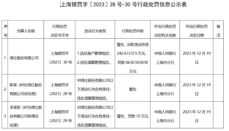 具体而言,以时间顺序由近及远来看,2023年12月底,央行上海分行发布的行政处罚罚单显示,因违反商户管理规定;违反清算管理规定,得仕股份被警告,并没收违法所得约242.62万元,罚款8630.5万元,合计罚没超8873万元。