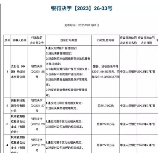 同日,支付宝也因与身份不明客户交易;违反清算、支付账户管理规定;违反防范电信网络新型违法犯罪等“七宗罪”,被警告并罚没超30亿元。柒财经注意到,除上述千万级罚单外,安付宝商务有限公司、通联支付网络服务、上海盛付通电子支付在去年12月末也分别收到394.16万元、200万元及100万元罚单。