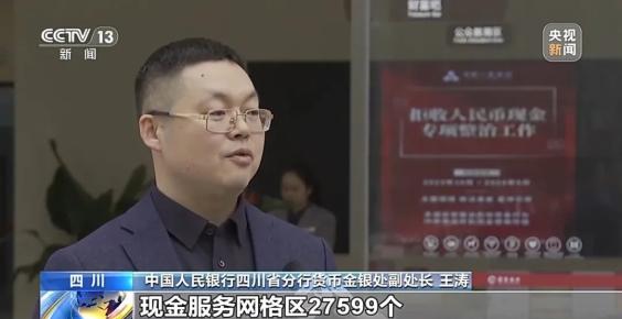 中国人民银行四川省分行货币金银处副处长 王涛:全省共建成现金服务网格区27599个,实现社区、村委会覆盖率98%以上。遇拒收现金行为 可投诉举报
