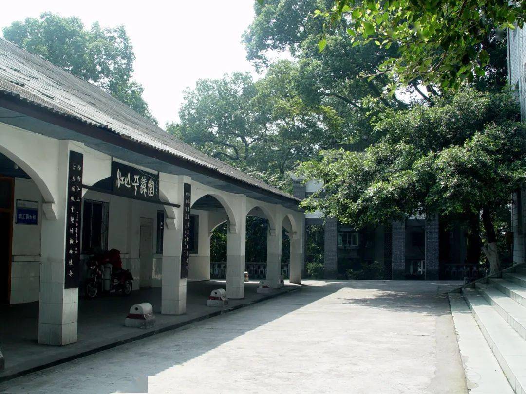 西南医科大学90岁的张医生回忆,古迹山门坊,在江山平远堂旁边,共6根立柱,中间两根是石柱,其余4根柱均是空心砖。正门两边扇面屏风呈八字形,双层门建筑,屏风顶端呈尖山形,“忠山”牌坊上方有石刻大菊花一朵,牌坊两侧有耳墙。