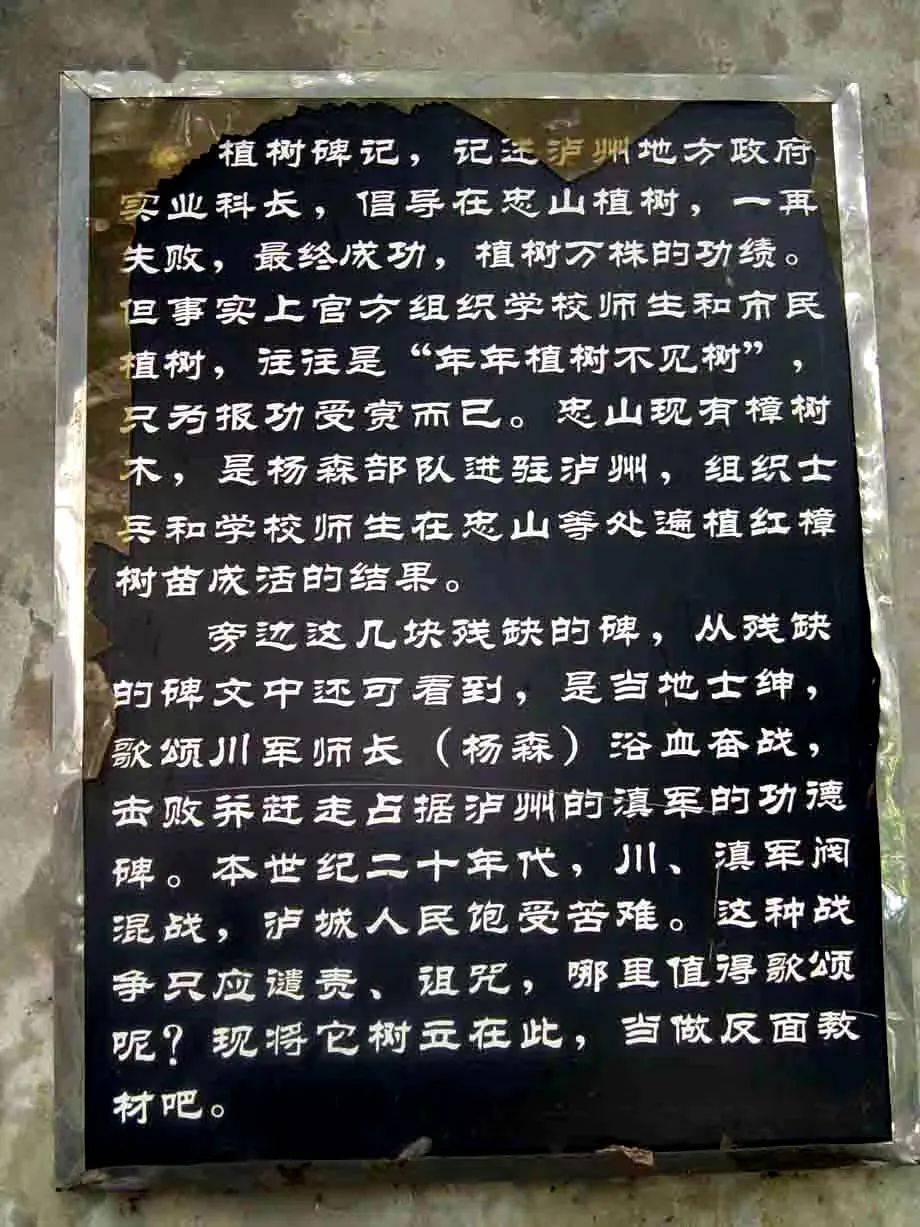 《忠山植树记》大碑记录了民国九年(1920),永宁道兼科长温曲先(是温筱泉举人的独子),根据公家颁布的植树节大力倡导植树,宣传植树的四大好处。民国十六年,温曲先再任泸县实业局长,从1920年他“建励行植树议”起,经过八年时间争取,到1928年,才得以“会同城文武将吏、法团绅耆、工商学之人士,大植树于县西忠山之麓”……红樟树是国家植物保护品种,忠山是四川红樟树育种基地。当时树已培封以万计,造福后人。
