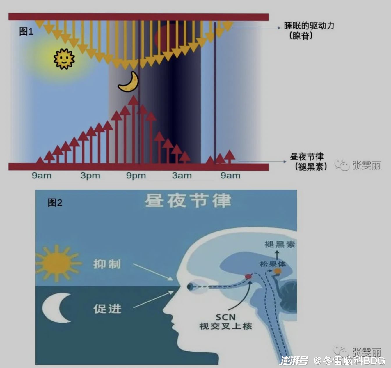 “日出而作,日落而息”,这规律是刻在我们人类基因密码里的。太阳升起,人类开始劳作,劳作时就会耗能,耗能后产生的代谢产物叫腺苷(图1),腺苷是夜晚睡眠的原动力,也可以理解为睡眠的饥渴程度(也叫睡眠驱动力)。日间活动量越多腺苷产生越多,睡眠的欲望越大。如果白天间断补觉或者经常躺在床上,腺苷分泌减少,夜间睡眠的动力会不足,从而导致入睡困难及睡眠深度不够。除了腺苷以外调节我们睡眠稳态另一个重要物质—褪黑素,褪黑素分泌与太阳的升起和降落有关(图1和图2)。当太阳升起时,光线透过人类的视网膜到视交叉上核再到松果体抑制褪黑素分泌,夜间的过程正好相反,太阳降落,褪黑素分泌增加,人就会感到困意。综上所述,褪黑素是开启睡眠的钥匙,腺苷是睡眠的原动力,保持白天的活跃度和光照的时间。在白天不困的情况下不要强行午休,如果日间困意不能阻挡建议只躺15-30分钟。