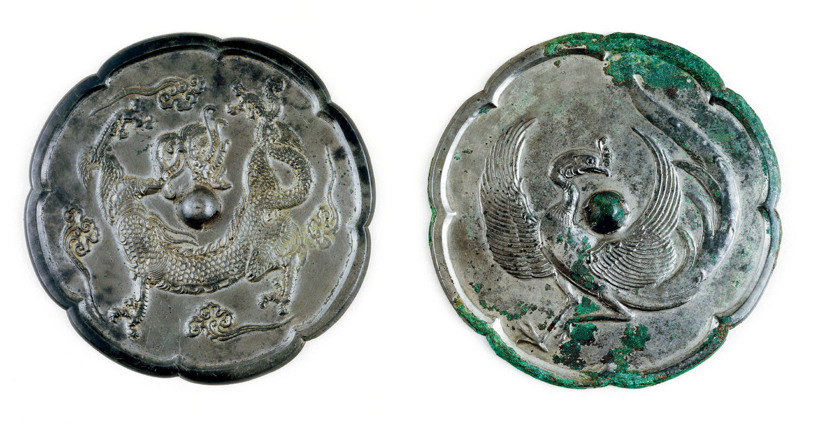 图5 两枚唐代铜镜,分别饰有龙凤图案,8世纪,直径15.8和16厘米,大英博物馆收藏。