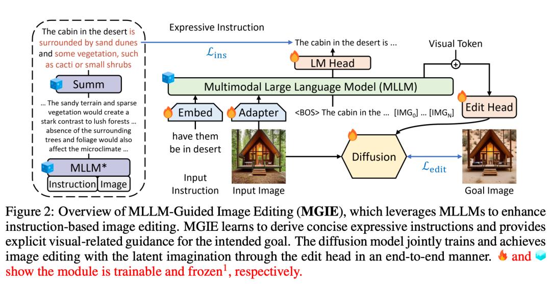 实现预期的编辑目标。然后,MGIE 能够理解具有视觉感知的模糊命令,从而进行合理的图像编辑(架构图如上图 2 所示)。