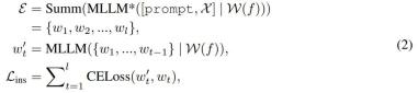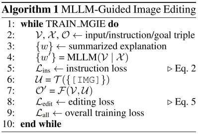 算法 1 展示了 MGIE 学习过程。MLLM 通过指令损失 L_ins 导出简洁指令 ε。借助 [IMG] 的潜在想象,