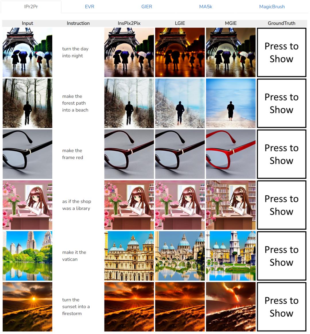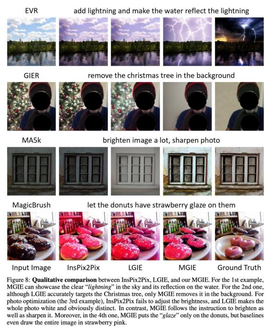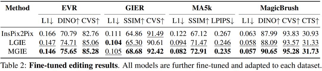 为了研究针对特定目的的基于指令的图像编辑,表 2 对每个数据集上的模型进行了微调。对于 EVR 和 GIER,所有模型在适应 Photoshop 风格的编辑任务后都获得了改进。MGIE 在编辑的各个方面始终优于 LGIE。这也说明了使用表达指令进行学习可以有效地增强图像编辑,而视觉感知在获得最大增强的明确引导方面起着至关重要的作用。