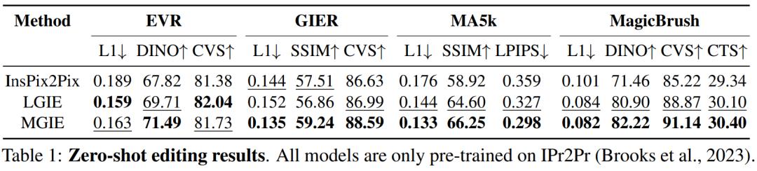 表 1 显示了模型仅在数据集 IPr2Pr 上训练的零样本编辑结果。对于涉及 Photoshop 风格修改的 EVR 和 GIER,编辑结果更接近引导意图(例如,LGIE 在 EVR 上获得了更高的 82.0 CVS)。对于 MA5k 上的全局图片优化,由于相关训练三元组的稀缺,InsPix2Pix 很难处理。LGIE 和 MGIE 可以通过 LLM 的学习提供详细的解释,但 LGIE 仍然局限于其单一的模态。通过访问图像,MGIE 可以得出明确的指令,例如哪些区域应该变亮或哪些对象更加清晰,从而带来显著的性能提升(例如,更高的 66.3 SSIM 和更低的 0.3 拍照距离),在 MagicBrush 上也发现了类似的结果。MGIE 还从精确的视觉想象中获得最佳性能,并修改指定目标作为目标(例如,更高的 82.2 DINO 视觉相似度和更高的 30.4 CTS 全局字幕对齐)。
