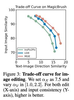 α_X 和 α_V 之间的权衡。图像编辑有两个目标:操作作为指令的目标和保留作为输入图像的剩余部分。图 3 显示了指令 (α_X) 和输入一致性 (α_V) 之间的权衡曲线。该研究将 α_X 固定为 7.5,α_V 在 [1.0, 2.2] 范围内变化。α_V 越大,编辑结果与输入越相似,但与指令的一致性越差。X 轴计算的是 CLIP 方向相似度,即编辑结果与指令的一致程度;Y 轴是 CLIP 视觉编码器与输入图像的特征相似度。通过具体的表达指令,实验在所有设置中都超越了 InsPix2Pix。此外, MGIE 还能通过明确的视觉相关引导进行学习,从而实现全面提升。无论是要求更高的输入相关性还是编辑相关性,这都支持稳健的改进。