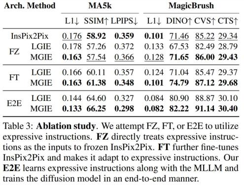 消融研究除此以外,研究者还进行了消融实验,考虑了不同的架构 FZ、FT 以及 E2E 在表达指令上的性能 。结果表明,在 FZ、FT、E2E 中,MGIE 持续超过 LGIE。这表明具有关键视觉感知的表达指令在所有消融设置中始终具有优势。