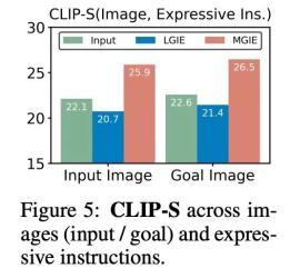 为什么 MLLM 引导有用?图 5 显示了输入或 ground-truth 目标图像与表达式指令之间的 CLIP-Score 值。输入图像的 CLIP-S 分数越高,说明指令与编辑源相关,而更好地与目标图像保持一致可提供明确、相关的编辑引导。如图所示,MGIE 与输入 / 目标更加一致,这就解释了为什么其表达性指令很有帮助。有了对预期结果的清晰叙述,MGIE 可以在图像编辑方面取得最大的改进。