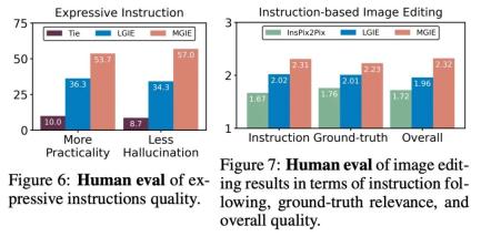 人工评估。除了自动指标外,研究者还进行了人工评估。图 6 显示了生成的表达指令的质量,图 7 对比了 InsPix2Pix、LGIE 和 MGIE 在指令遵循、ground-truth 相关性和整体质量方面的图像编辑结果。