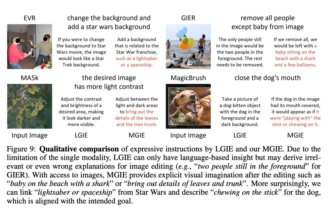 定性比较。图 8 展示了所有使用数据集的可视化对比,图 9 进一步对比了 LGIE 或 MGIE 的表达指令。