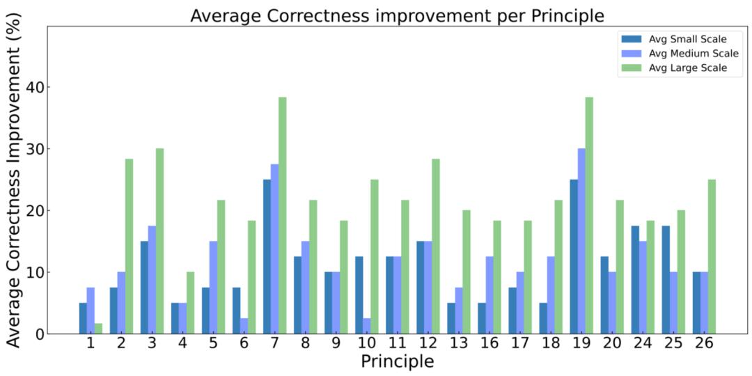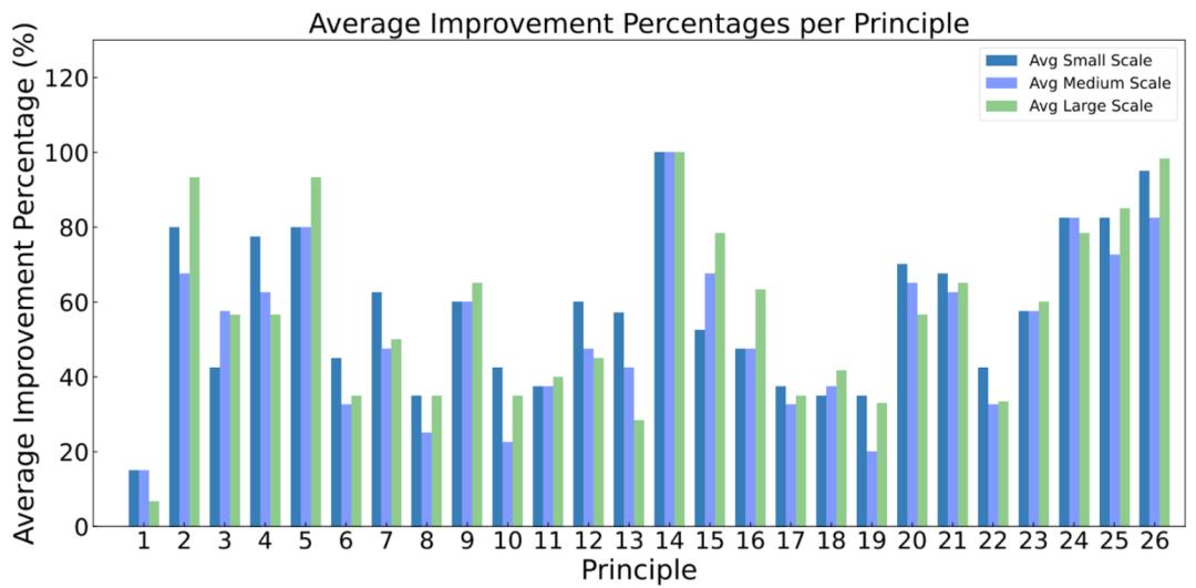 上图是每个不同大小的模型相对提升幅度,可以看到类似的现象,模型越大,对于提示词的响应和回复也越加敏锐,准确性提升也相对越大。4. 下图是不同大小模型对于每条提示词原则准确度提升大小具体结果: