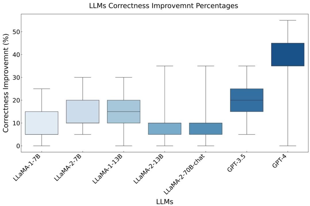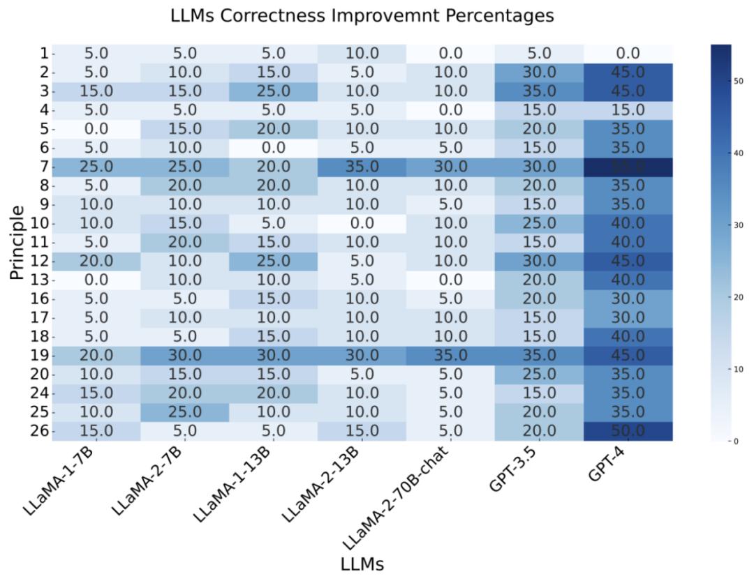 可以看到所有提示词原则在人工评测中都取得了或多或少的提升,其中原则 14 获得了 100% 的提升,意味着所有问题通过使用该提示原则都获得了提升。与此同时,原则 1 得到的提升相对较少。2. 回复正确性提升:正确性指模型输出或回答的精度,判断标准是回答是否准确、相关且没有错误的。本文同时考虑了不同模型的绝对正确性和相对正确性提升两个指标。