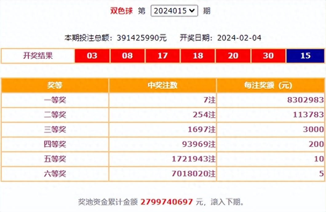 2月4日晚,中国福利彩票双色球游戏第2024015期开奖,红球号码为03、08、17、18、20、30,蓝球号码为15。