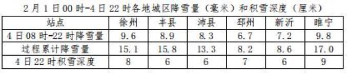 受冷暖气流共同影响,2月1日凌晨开始全市出现降雪,截至4日22时,徐州主城区累计降雪量15.1毫米,全市最大降雪量17.0毫米(睢宁)。