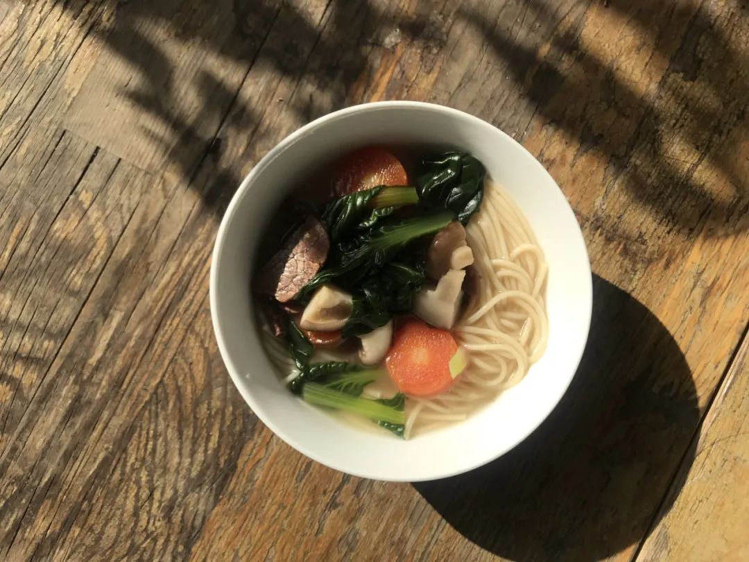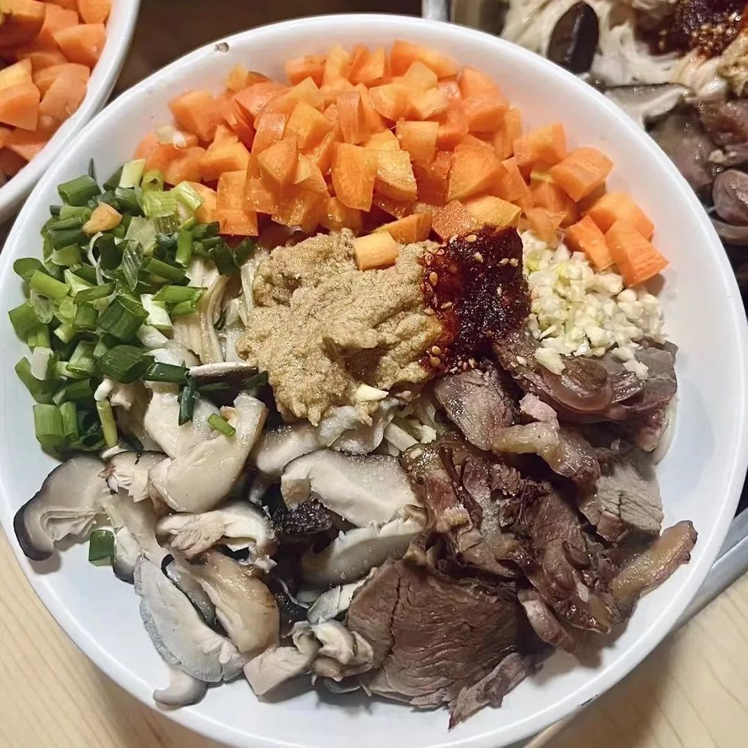 ●食通社厨艺天花板Wanica同学离职前,给大家做了一顿热干面,配料信手拈来,除了用了自己做的泡菜,还用了香菇。也许在武汉人看来是邪教,但在食通社嘴里,那真是美味啊!图片:梅颖另外一个要点是量够大,大到在一道菜里占比四分之一。做土豆、山药、莲藕一类高淀粉食材,我用这类“添加剂”的比例还会再高一些,有时高至半壁江山。
