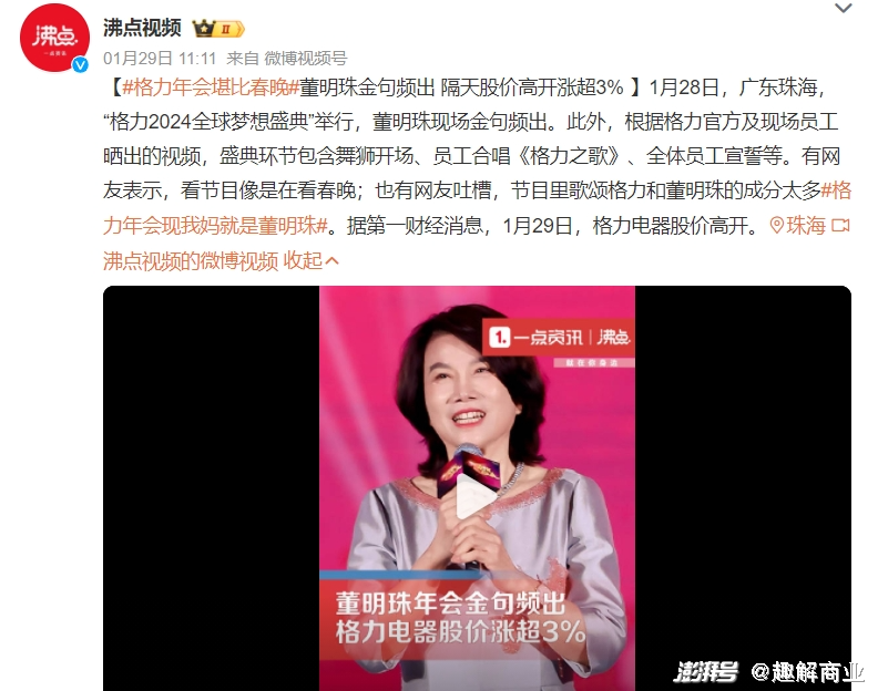 这段时间,喜剧电影《年会不能停》引起了不少“打工人”的共鸣。而就在近日,格力电器(000651.SZ)在“万众瞩目”之下举办了自己的年会——“2024全球梦想盛典”,并在网络上引发了热议。